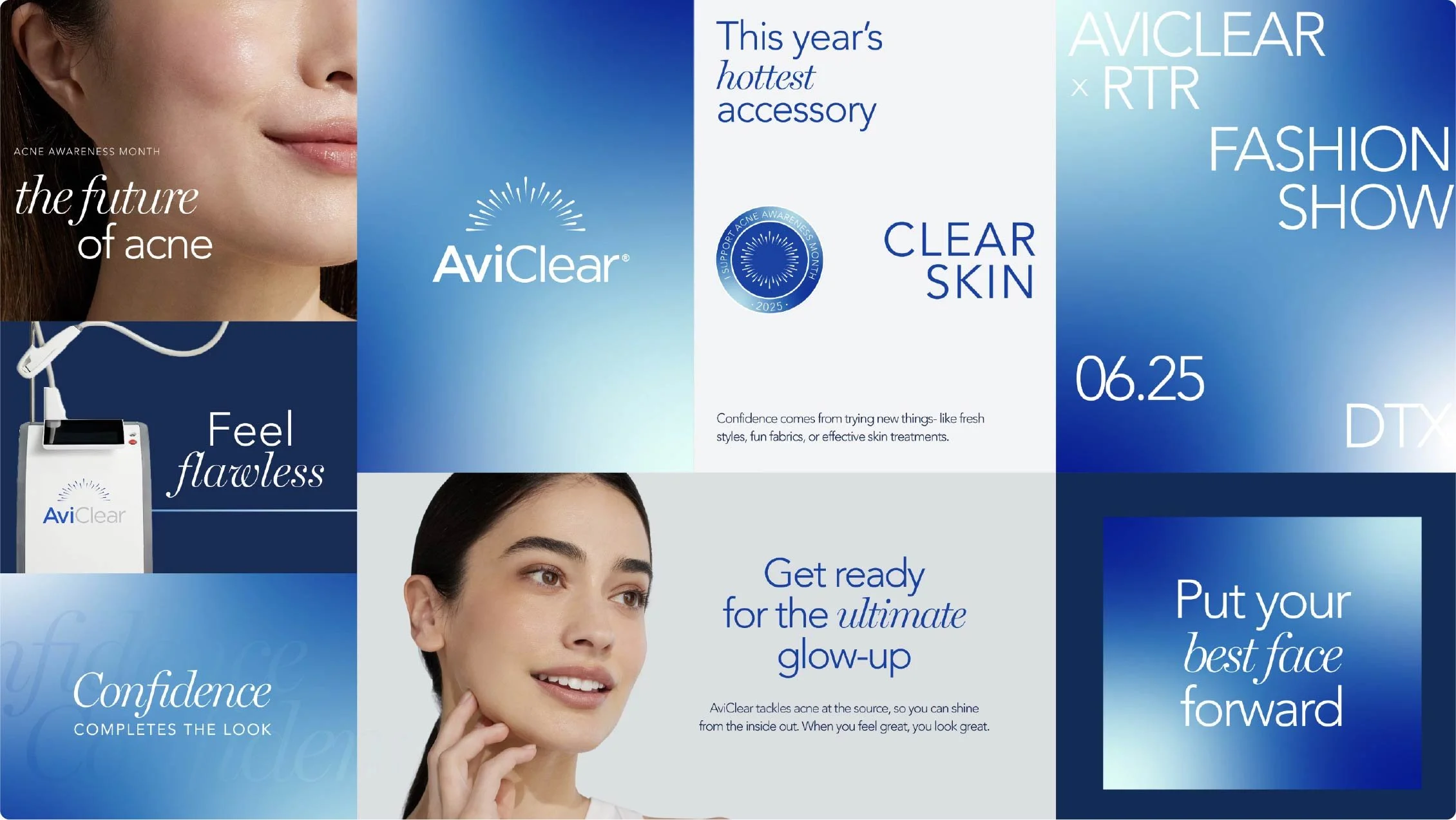AviClear, a laser device with the Cutera parent company, is the first FDA-cleared energy device for treating mild, moderate, and severe acne. With various acne treatments available, such as Isotretinoin, over-the-counter products, and prescription creams and pills, our goal was to create a brand identity that highlights the company's dedication to cutting edge technology and consumer results and satisfaction. We aimed to empathize with patients wishing for their acne to disappear. We developed a modern brand that balances approachability with professionalism, to showcase the device and its impressive results.